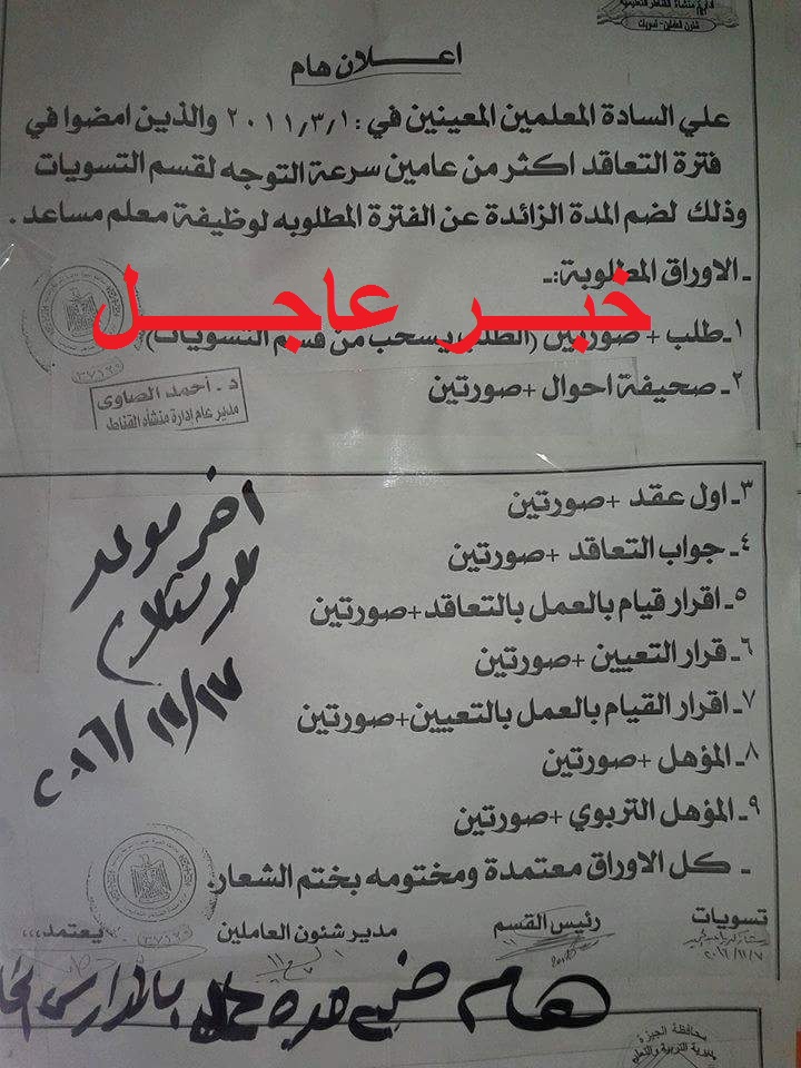 السبورة التعليم ضم سنوات خدمة التعاقد للمعلمين المعينين فى مارس 2011